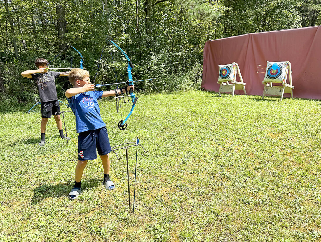 Brothers Kaleb, 10, (front) and Alex Wilson, 13, practice their aim at Camp Anderson’s archery range Saturday. Their grandfather, Robert Stager, was an Eagle Scout whose name is on a plaque at the camp. Mirror photo by Matt Churella