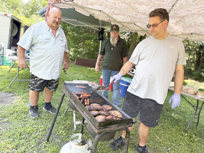 - Matt Isenberg (right) cooks hamburgers and hot dogs as his fellow volunteers Don Irvin (left) and Alan Weaver look on during Camp Anderson’s open house Saturday. Mirror photo by Matt Churella