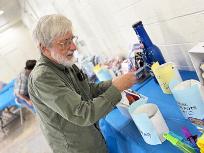 - Brooks Sutor places tickets in bins for Camp Anderson’s 100th anniversary open house celebration Saturday. Baskets featured soap, school supplies, baked goods, jewelry and a bubble-making machine. Mirror photo by Matt Churella