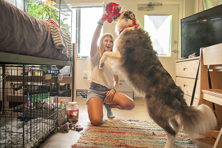 Sophie Nocera, 21, a senior at Eckerd College, plays with her dog, Zuko, in her college dorm on Aug. 20 in St. Petersburg, Fla. The Associated Press