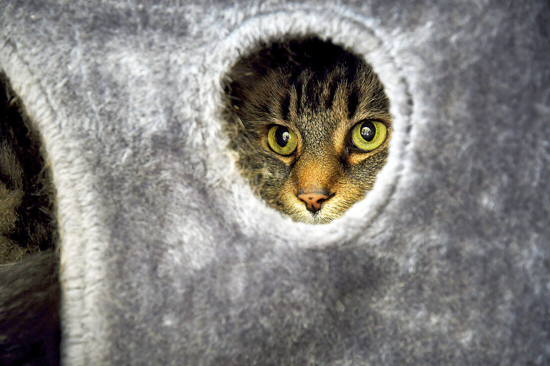 - Student Molly Cheer’s pet comfort cat, Louie, peers out of his shelter in her dorm room at the University of Northern Colorado in Greeley, Colo., on Monday. The Associated Press