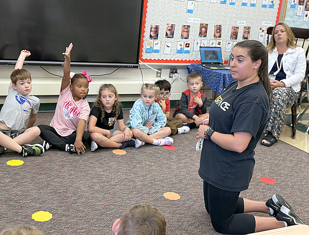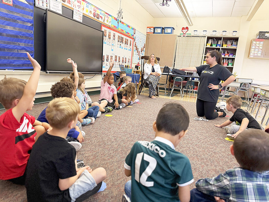 Professional soccer player and entrepreneur Alexia Michitti talks to kindergarten students in Melanie Gearhart’s class Tuesday at Pleasant Valley Elementary. Mirror photo by Matt Churella