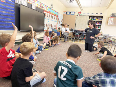 Professional soccer player and entrepreneur Alexia Michitti answers questions from kindergarten students in Melanie Gearhart’s classroom Tuesday at Pleasant Valley Elementary School. Mirror photo by Matt Churella