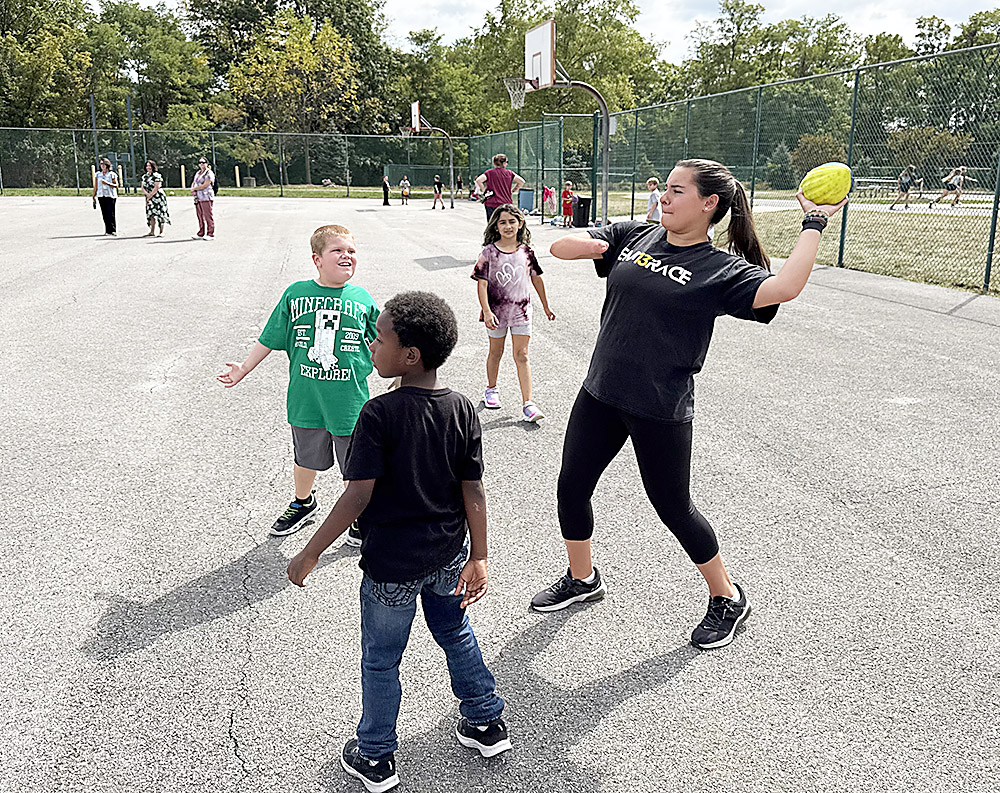 Athlete and entrepreneur Alexia Michitti plays football with Pleasant Valley Elementary second graders (from left) Miles Noll, Carter Downey and Davina Lee during recess Tuesday afternoon. Mirror photo by Matt Churella