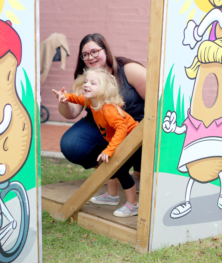 - Mia Rogers, 3, plays at potato cutout stands with her mother, Hannah Pettenati, at PotatoFest on Saturday. Mirror photo by Colette Costlow