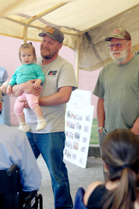 Ethan Hoover holds his daughter, Eilia Hoover, 1, while talking with people alongside Bob Davis. Mirror photo by Colette Costlow.