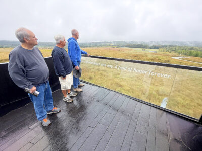Brothers (from left) George and Gary Mueller and Dr. Daniel Meenan gaze at the ‘field of honor’ where United Airlines Flight 93 crashed on Sept. 11, 2001, from the Flight 93 National Memorial’s flight path overlook. Mirror photo by Matt Churella