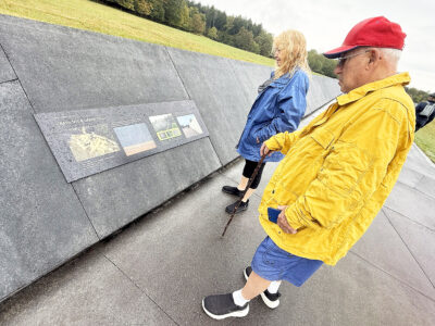Kathleen Swanson and Joseph Romano Sr., both of southern New Jersey, read a sign at the Flight 93 National Memorial’s memorial plaza. Located in Stonycreek Township, Somerset County, the plaza is a black walkway that marks the edge of the debris field and crash site. It’s about a quarter of a mile in length and connects the visitor shelter with the wall of names, where people can pay their respects to the 40 passengers and crew members who lost their lives. A large boulder marking the crash site is viewable from the plaza. Mirror photo by Matt Churella
