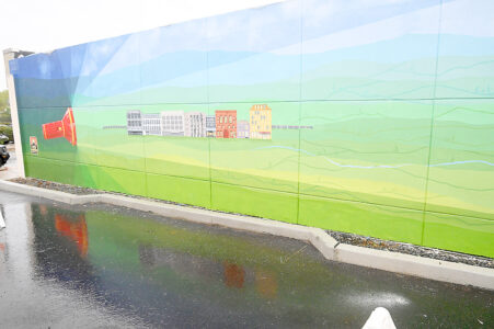 Its treatment also includes successively vibrant color for the buildings in a downtown scene, starting with black-and-white on the left and ending with a full palette of colors on the right — a transition designed to represent the move from the old days to the current downtown revival.