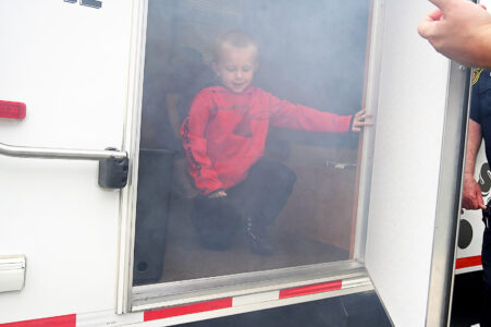 Juniata Elementary first grader Lyrik Mitchell exits the simulated smoke filled Logan Township Fire Service Fire Safety House during fire safety week activities.
