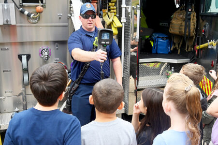 - Altoona City firefighter Jonathan Smith shows his face on a thermal imaging camera while he shows gear carried on fire apparatus to Juniata Elementary School students on Tuesday afternoon. Mirror photo by Patrick Waksmunski