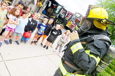Greenwood firefighter Tony Lardieri dons his gear to familiarize Juniata Elementary School students on Tuesday afternoon. The program was presented jointly by Altoona City Fire and Logan Township Fire Services as part of Fire Prevention Week.