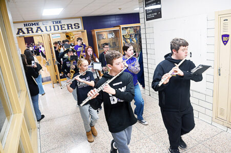 The Bishop Guilfoyle Academy Marching Band leads the Bishop Guilfoyle girls soccer team through the school during the team's send-off on Friday to the state final in Manchester. Mirror photo by Patrick Waksmunski