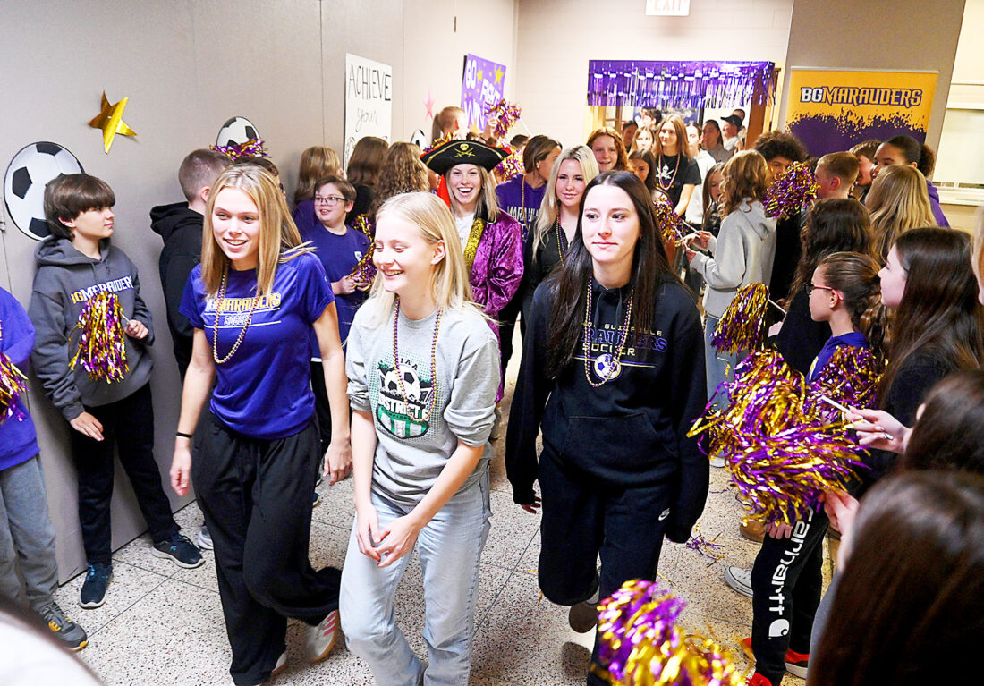 - The Bishop Guilfoyle Academy Marching Band leads the Bishop Guilfoyle girls soccer team through the school during the team’s send-off on Friday to the state final in Manchester. Mirror photo by Patrick Waksmunski