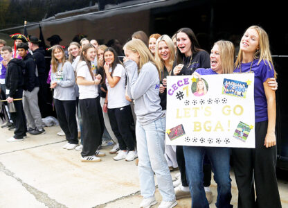 - Members of the Bishop Guilfoyle Academy girls soccer team are cheered on during the team’s send-off on Friday to the state final in Manchester. Mirror photo by Patrick Waksmunski