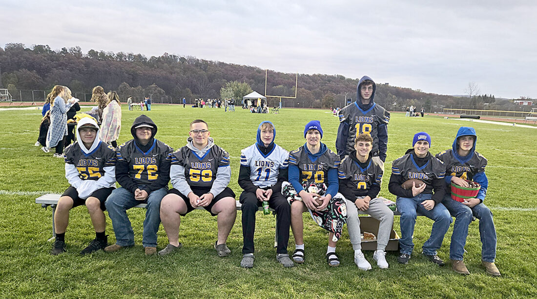- Lion Football Player, #55 Kolby Miller, #72 Kaden Imler, #59 Owen Miller, #11 Cade Emerick, #70 Caden Hinson, #8 Garrett Weyandt, #2 Garrett Hubbard, #14 Marcus Weaver, and #18 Logan Pletcher Pose for a photo before their sessions began. Courtesy photos