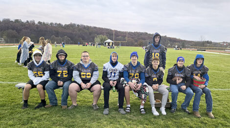 Lion Football Player, #55 Kolby Miller, #72 Kaden Imler, #59 Owen Miller, #11 Cade Emerick, #70 Caden Hinson, #8 Garrett Weyandt, #2 Garrett Hubbard, #14 Marcus Weaver, and #18 Logan Pletcher Pose for a photo before their sessions began. Courtesy photos