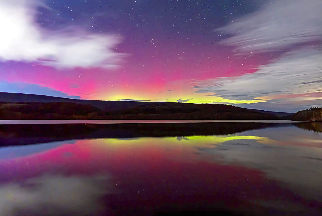 A break in the clouds shows the northern lights painting the sky above Canoe Creek on Tuesday night. Solar storms brought colorful auroras to unexpected places on Tuesday and Wednesday, triggering northern lights in Europe and as far south as Kansas and Texas in the United States. Photo for the Mirror by Harold DeLozier