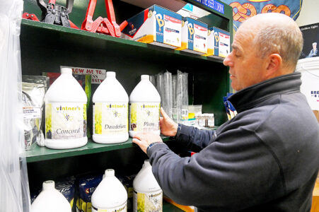 Winemaker and general manager Scott Schraff is seen with wine making supplies stocked at Oak Spring Winery. Mirror photo by Holly Claycomb