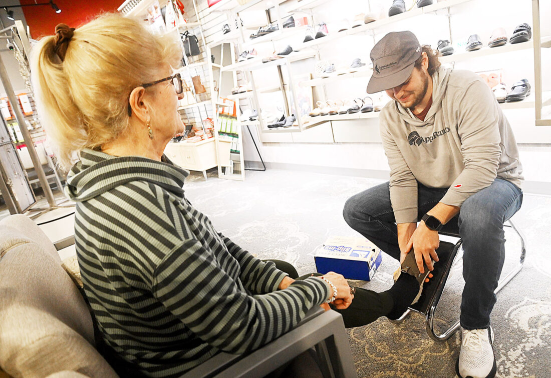 Shoe Fly associate Andrew Savino helps Jeannie Gentry of Huntingdon with a shoe selection and fit. Mirror photo by Patrick Waksmunski