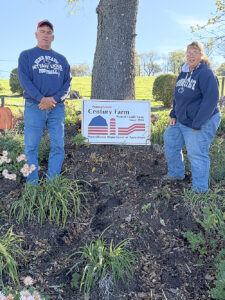 Cecilia Partsch and her husband, John Priselac stand with the sign designating their farm as a Pennsylvania Century Farm. Mirror photo by Walt Frank