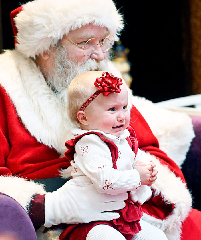 - Eleven-month-old Scarlett George sits on Santa’s lap for a photo at the Logan Valley Mall. Mirror photo by Patrick Waksmunski