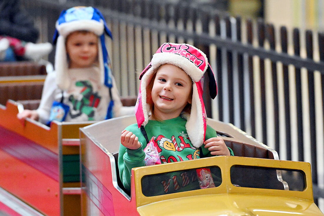 - Ainsley Mravintz, 4, and her brother, Wyatt Mravintz, 3, both of Ellwood City ride the train at the Logan Valley Mall after their visit with Santa. Mirror photo by Patrick Waksmunski