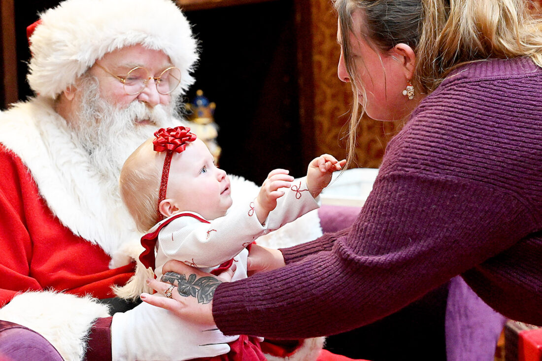 Amy George takes her 11-month-old daughter, Scarlett George, from Santa after a photo at the Logan Valley Mall. Mirror photo by Patrick Waksmunski