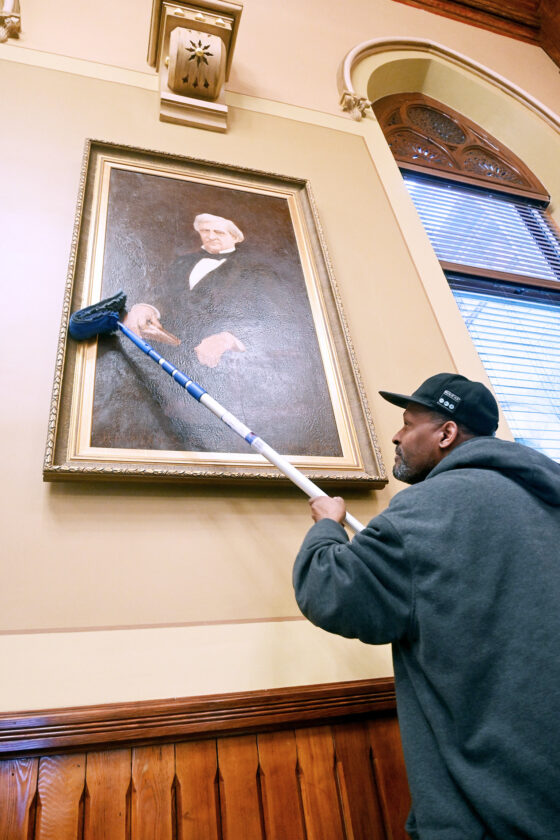 Blair County Courthouse custodian Marcus Mason dusts the restored portrait of the Honorable Jeremiah S. Black. Mirror photo by Patrick Waksmunski