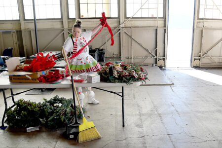 Designer Michelle Reid prepares holiday decorations inside a hangar at Peterson Space Force Base in Colorado Springs, Colo., on Dec. 18 in advance of the annual NORAD Tracks Santa Operation at the North American Aerospace Defense Command. The Associated Press