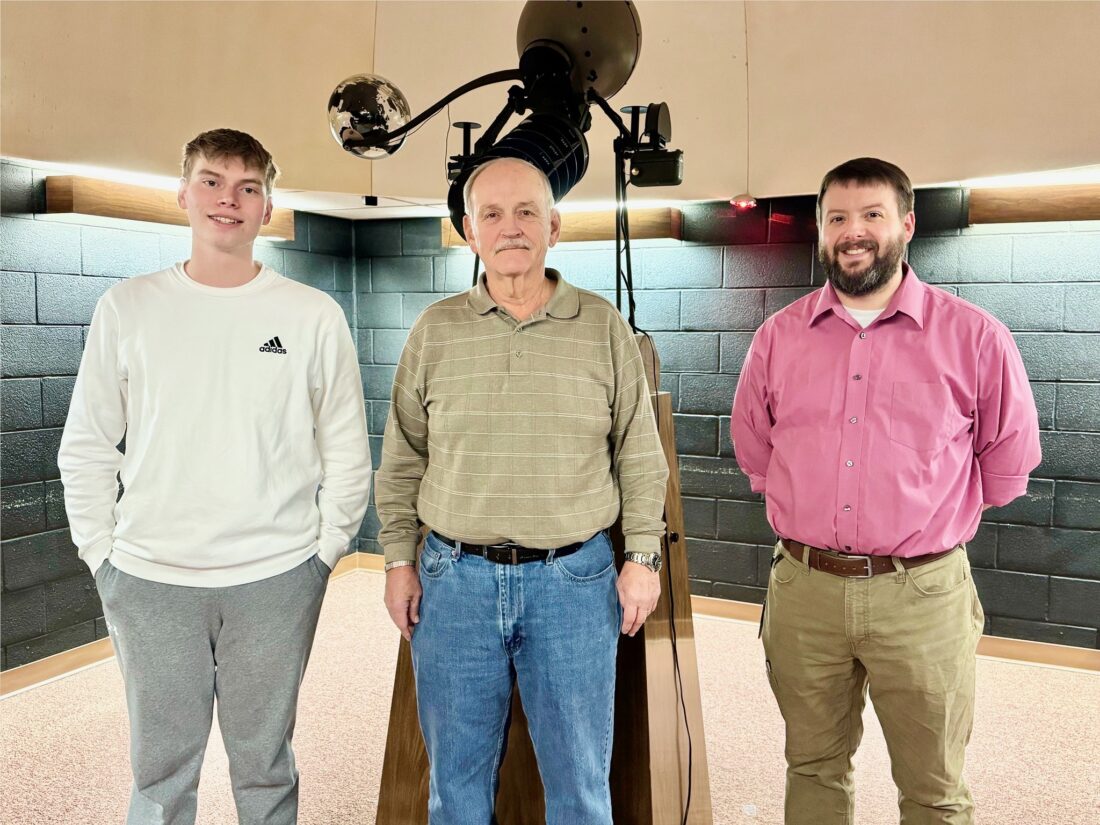 Mirror photo by Colette Costlow / Glendale senior Scott Beers (from left) stands next to former science teacher Paul Conway and current science teacher Ethan Maneval in front of the planetarium projector.