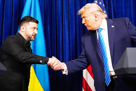 President Donald Trump and Ukraine President Volodymyr Zelenskyy shake hands at a news conference after a meeting at Trump’s Mar-a-Lago club on Sunday in Palm Beach, Fla. The Associated Press