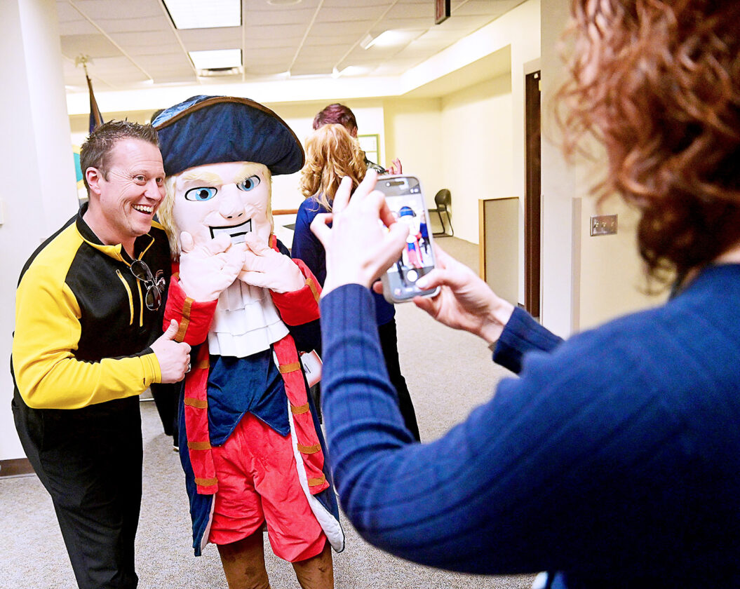 Blair County Commissioner Laura Burke photographs Altoona Curve Marketing, Promotions and Special Events Director Mike Kessling with county mascot Lionel Liberty during the America250PA Blair County Kickoff event at the Blair County Courthouse on Friday afternoon. Mirror photo by Patrick Waksmunski