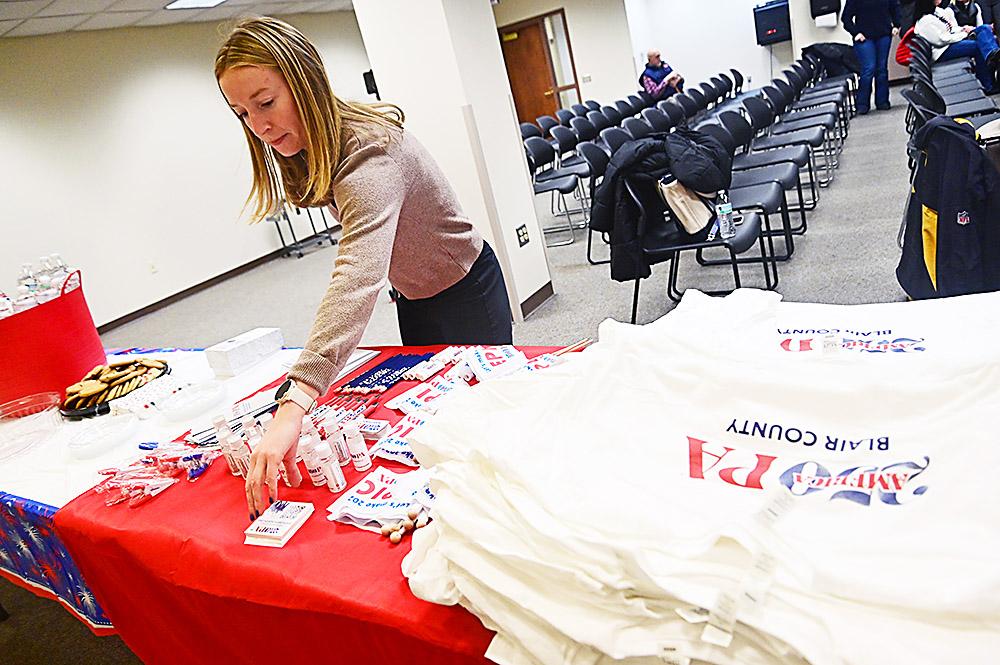 - America250PA Digital and Communications Manager Kasey Elliott places memorabilia for attendees of the America250PA Blair County Kickoff event at the Blair County Courthouse on Friday afternoon. Mirror photo by Patrick Waksmunski