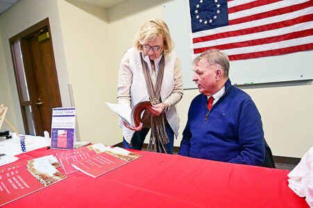 "A Revolutionary War History of Blair County" author Jim Lowe talks about his book with Cather Schimminger of Altoona during the America250PA Blair County Kickoff event at the Blair County Courthouse on Friday afternoon. Mirror photo by Patrick Waksmunski