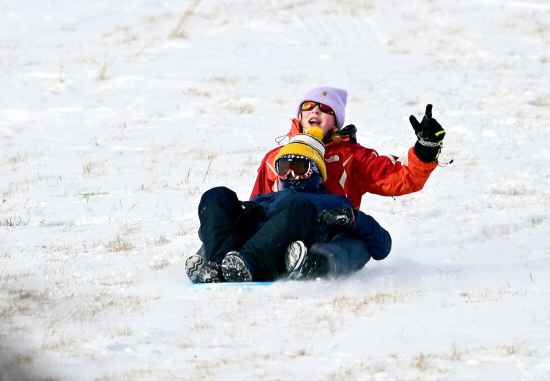 Seton Munjack (front), 10, and Amelia Coleman, 13, both of Ebensburg, take a sledding run down the American Legion County Fairgrounds parking lot on Monday afternoon.