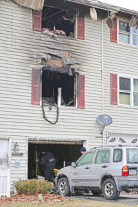 Pennsylvania State Police Fire Marshal Cpl. Scott M. Swasing (left) and Altoona City Fire Chief Adam Free investigate a late Thursday evening fire at a townhouse at 202 Hopewell Drive in Altoona. Mirror photo by Patrick Waksmunski
