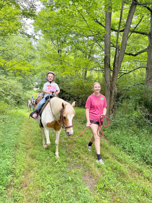 - In summer 2025, Paisley leads Bailey Marker, 7, on Zach through the woods at Harmony Horsemanship, where Paisley volunteers during the summertime. Courtesy photo