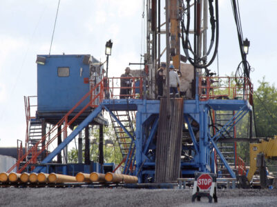 FILE - A crew works on a gas drilling rig at a well site for shale based natural gas in Zelienople, Pa. June 25, 2012. (AP Photo/Keith Srakocic, File)
