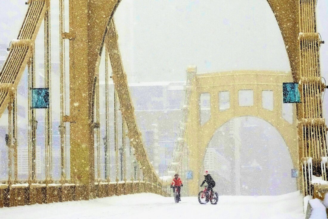 - A student pushes a bicycle across Fifth Ave., in the Oakland neighborhood of Pittsburgh during a winter storm Sunday. The Associated Press