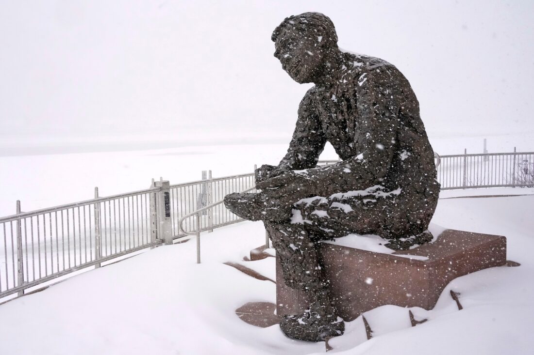 A statue of Fred Rogers overlooking the confluence of the Allegheny, Monongahela, and Ohio Rivers in downtown Pittsburgh at mid-morning Sunday. The Associated Press