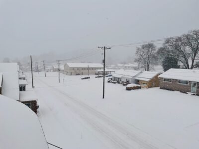 - Snow continues to fall Sunday morning along Adams Avenue in Tyrone.Mirror photo by Dan Isenberg