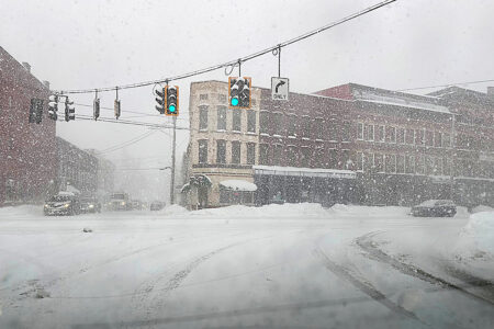 Fresh snow blows through an intersection in Lowville, N.Y., on Thursday. The Associated Press