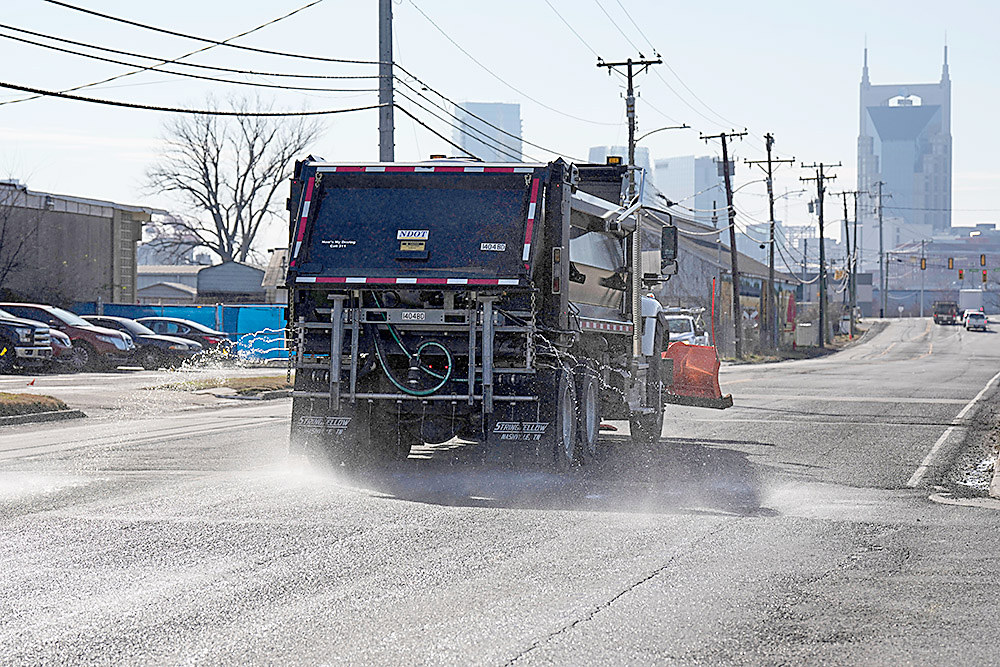 - A Nashville Department of Transportation truck applies salt brine to a roadway on Thursday in Nashville, Tenn., ahead of a winter storm expected to hit the state over the weekend. The Associated Press