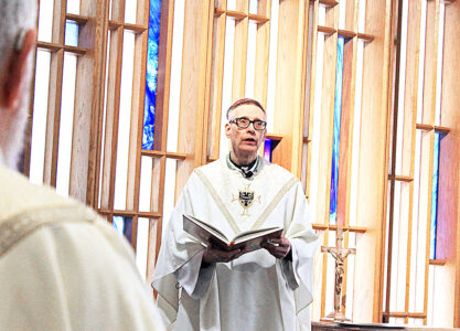 Bishop Mark Bartchak of the Altoona-Johnstown Diocese recites prayers Tuesday morning during Bishop Carroll's chapel rededication to honor Saint Carlo Acutis, who kept an internet database of miracles but died in 2006 to leukemia. Mirror photo by Colette Costlow.
