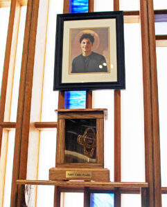- A relic of Saint Carlo Acutis and a framed picture hang in the Bishop Carroll chapel, now named after Acutis. Mirror photo by Colette Costlow.