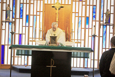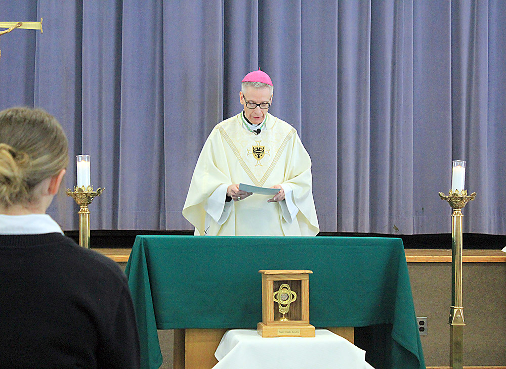 After a Mass celebrated by Bishop Mark L. Bartchak, the relic was placed on its dedicated shelf in the chapel by students Katie Thompson and Logan Klatt.
