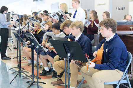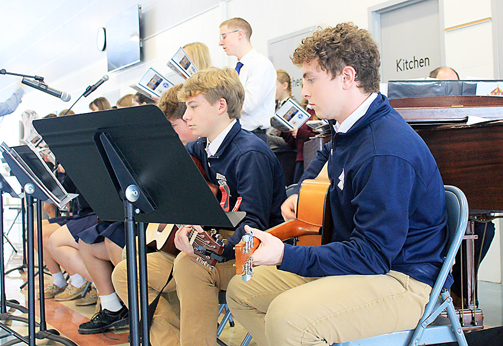 Junior Colin Beswenger (right) and Ethan Holtz play acoustic guitars with the Bishop Carroll liturgical ensemble on Tuesday morning during Mass before the chapel rededication. Mirror photo by Colette Costlow.
