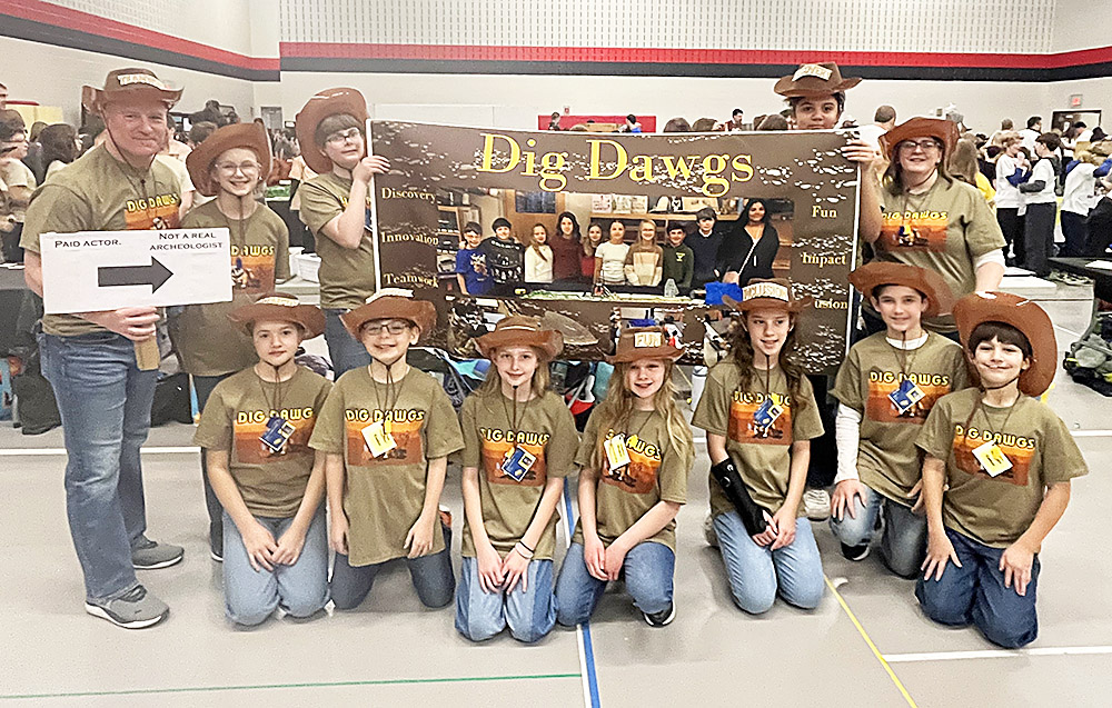 - Claysburg-Kimmel FIRST LEGO League students are pictured around a “Dig Dawgs” poster used during their robot pitch segment of the competition. Courtesy photo