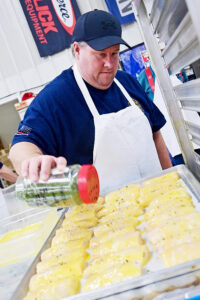 Excelsior firefighter Justin Shaw seasons a tray of fish to be baked. Mirror photo by Patrick Waksmunski